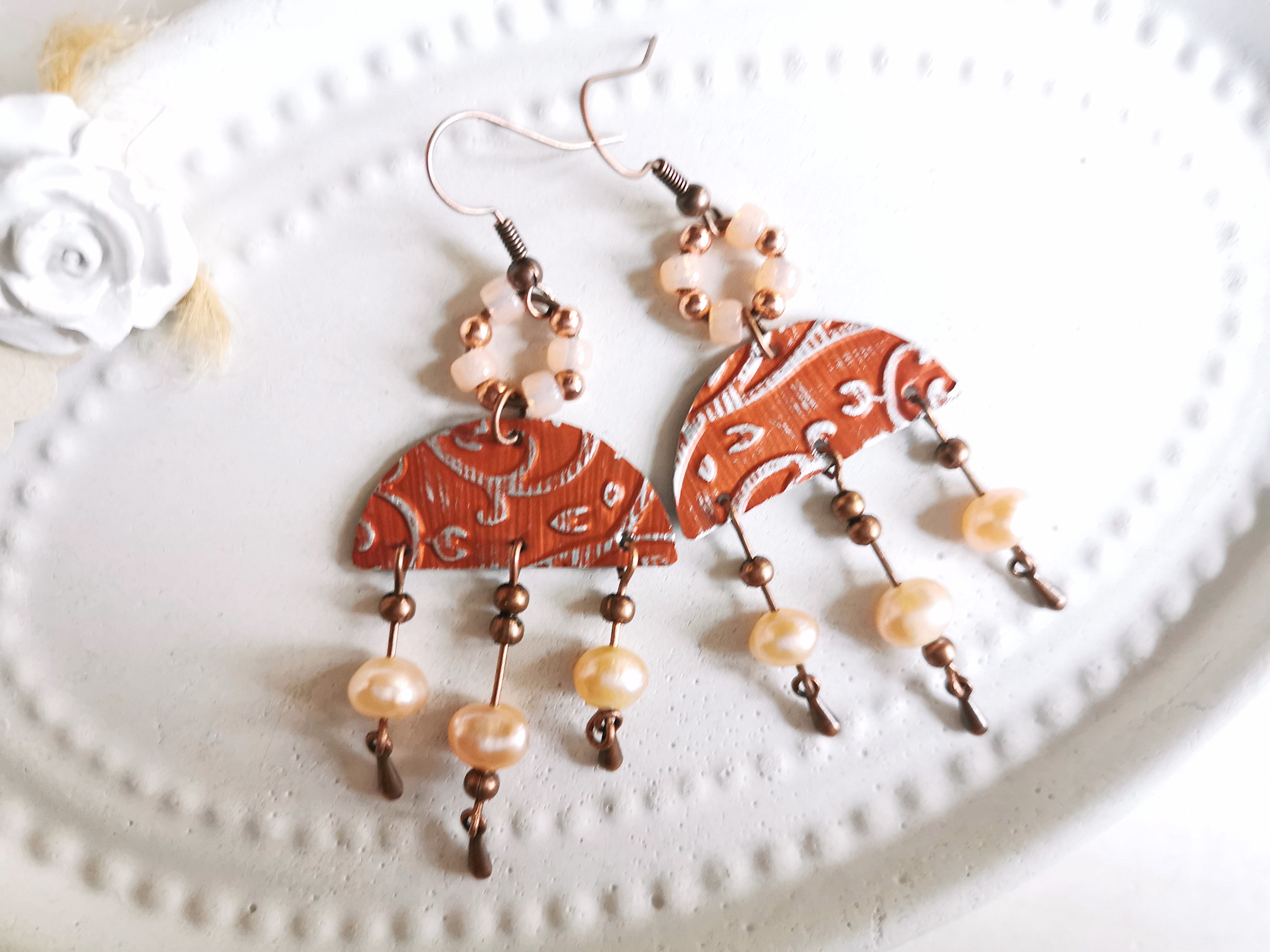 bei diesen tollen Ohrringe besteht ein vielfältiger Materialmix aus recyceltem Alu, echten Perlen in lachs, Toho Beads Glasperlen und Kupferelementen - alles farblich total aufeinander abgestimmt !