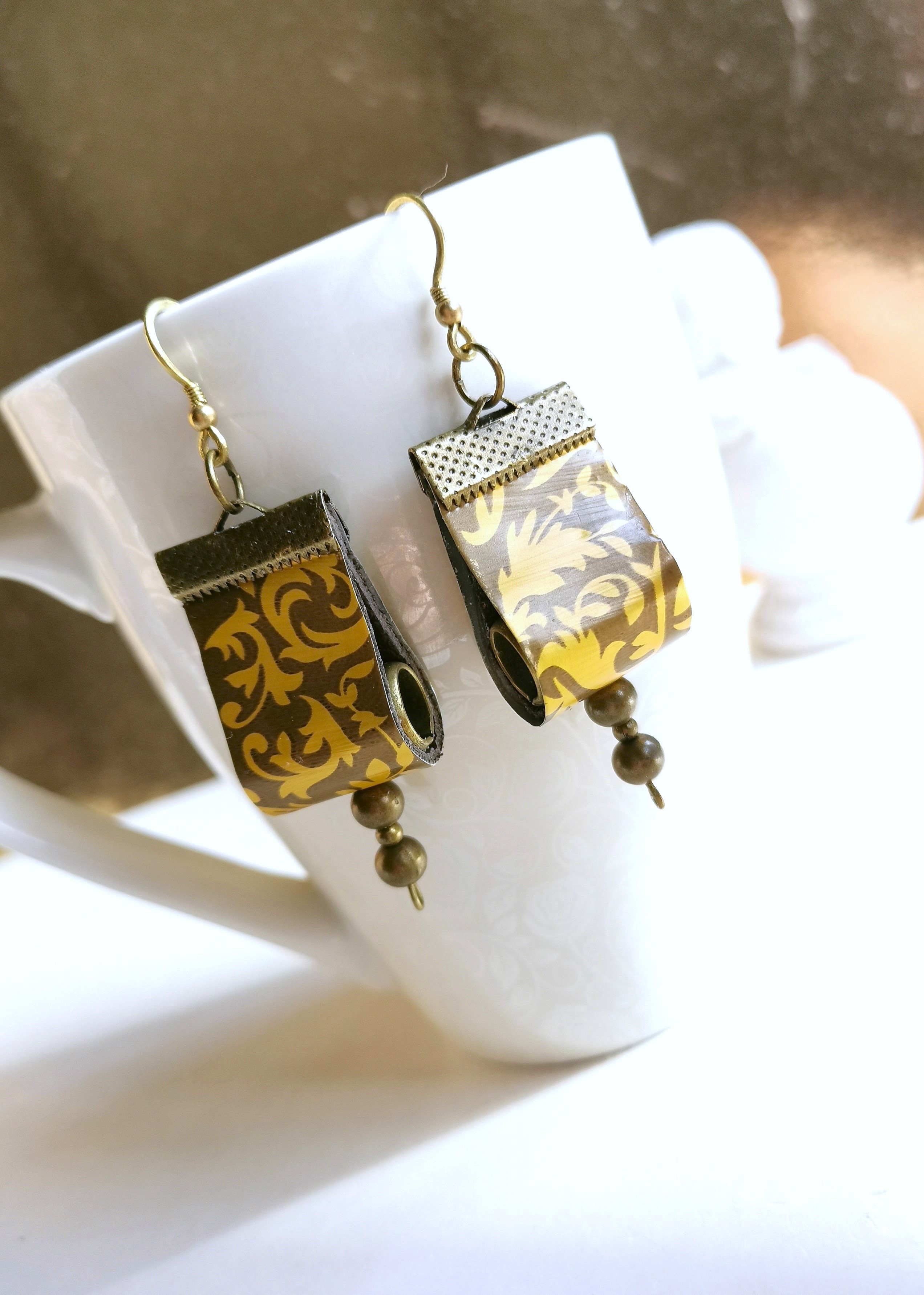 an "selbstgefertigten, stabilen Messing Ohrhaken" hängen ausgefallene edle Upcycling Schlaufen mit tollem Muster !