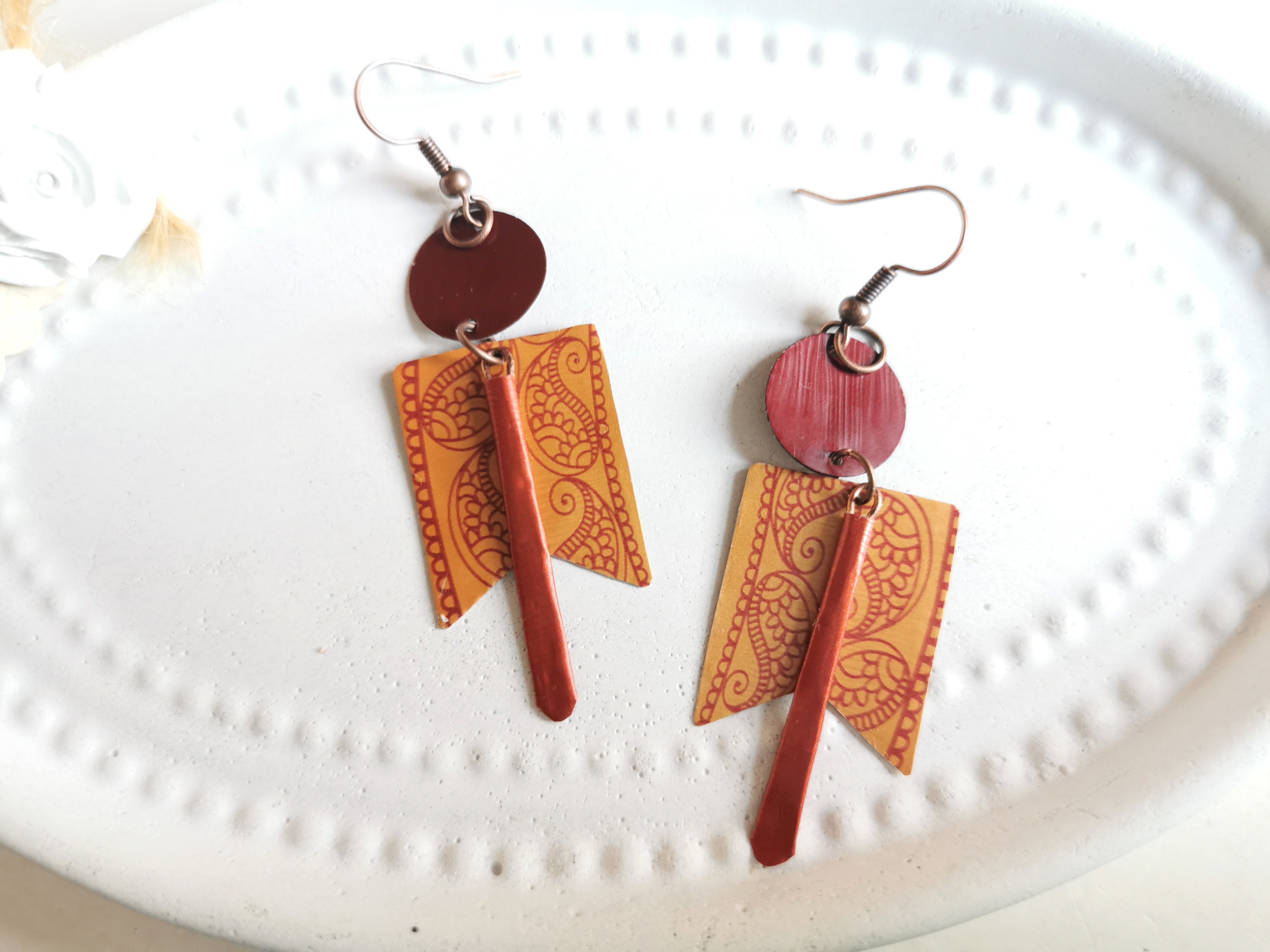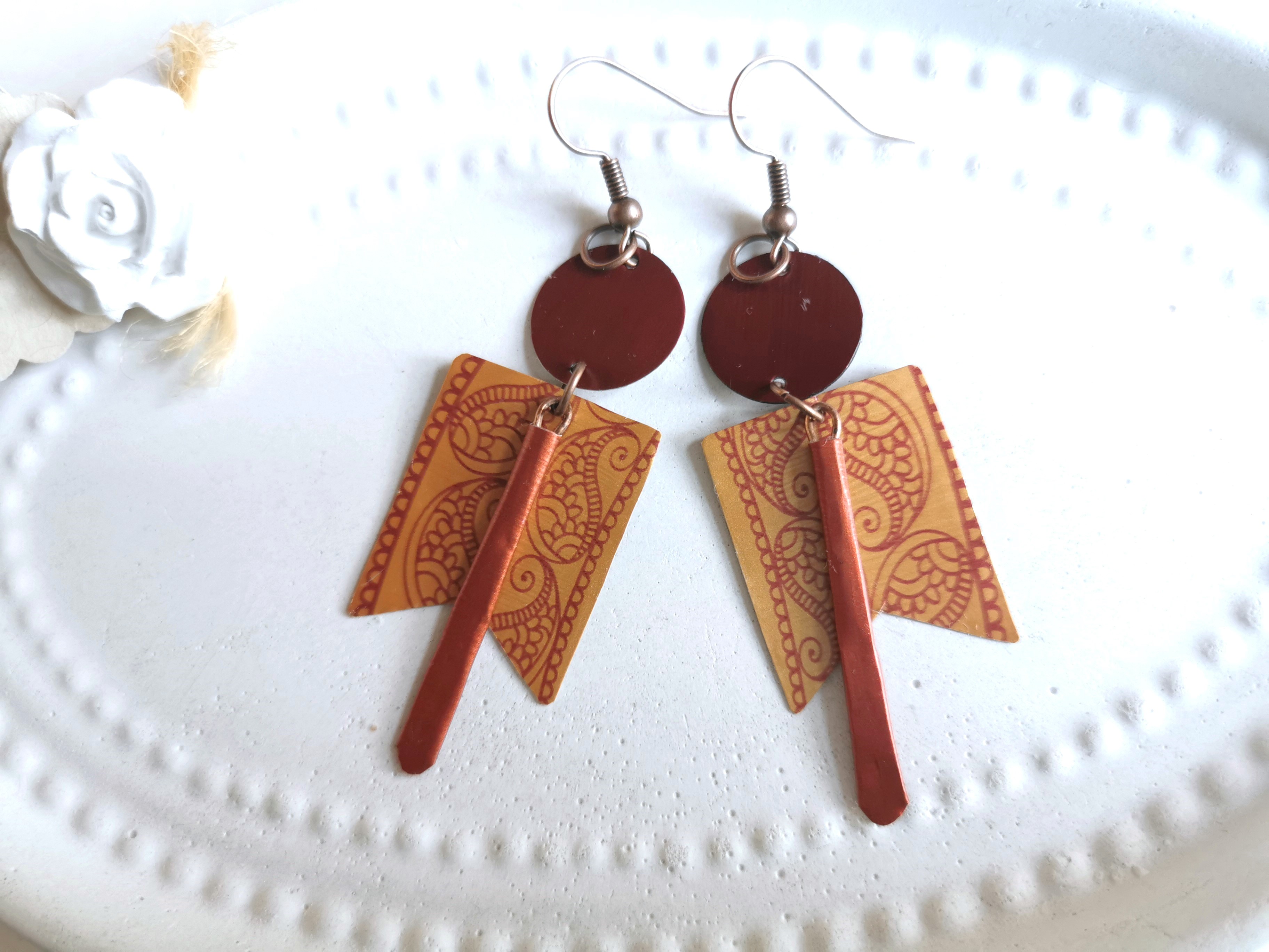 geo Upcycling Ohrringe in farblich abgestimmter Farbkombi mit Paisley Muster komplett aus Kaffeekapseln hergestellt.