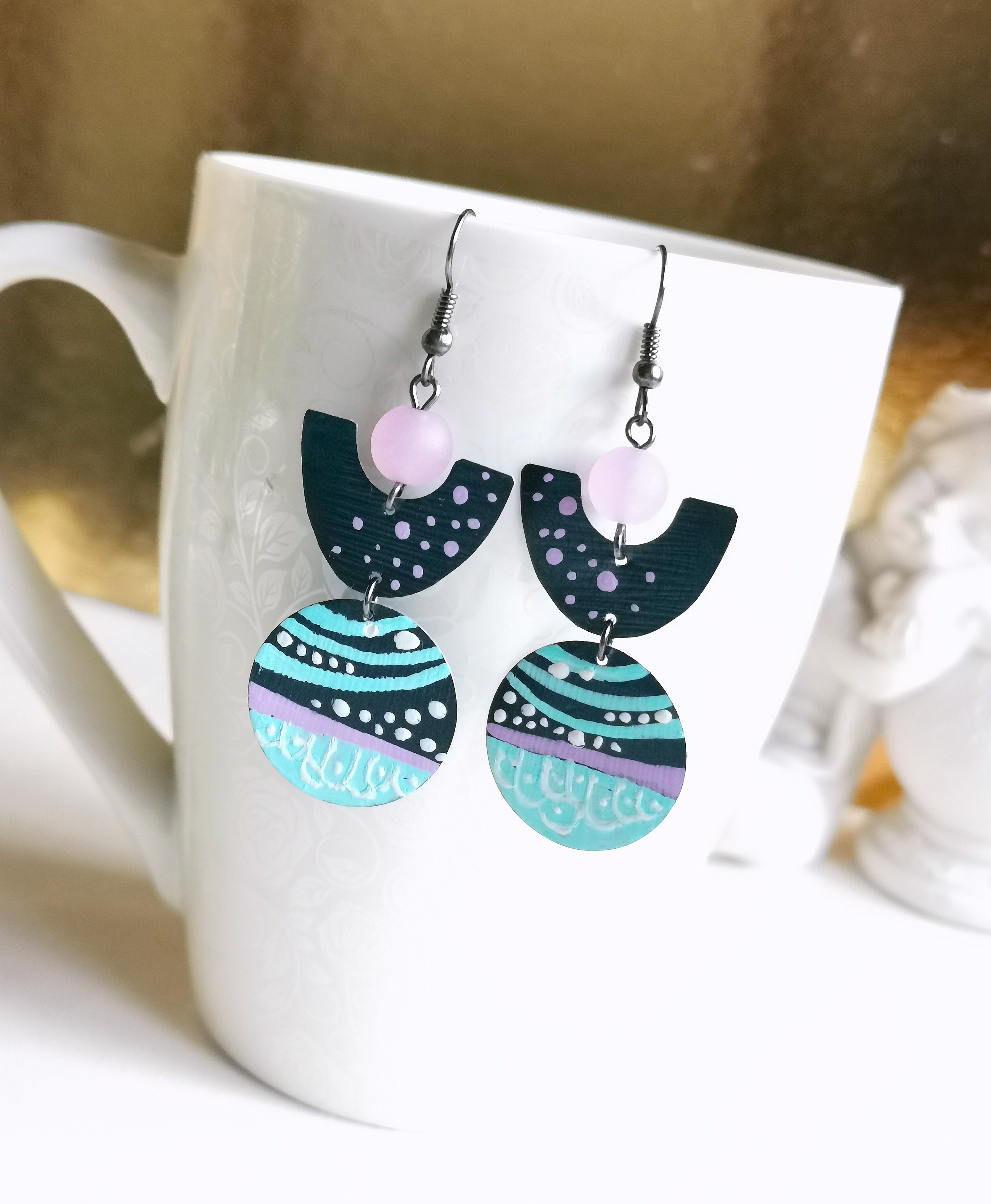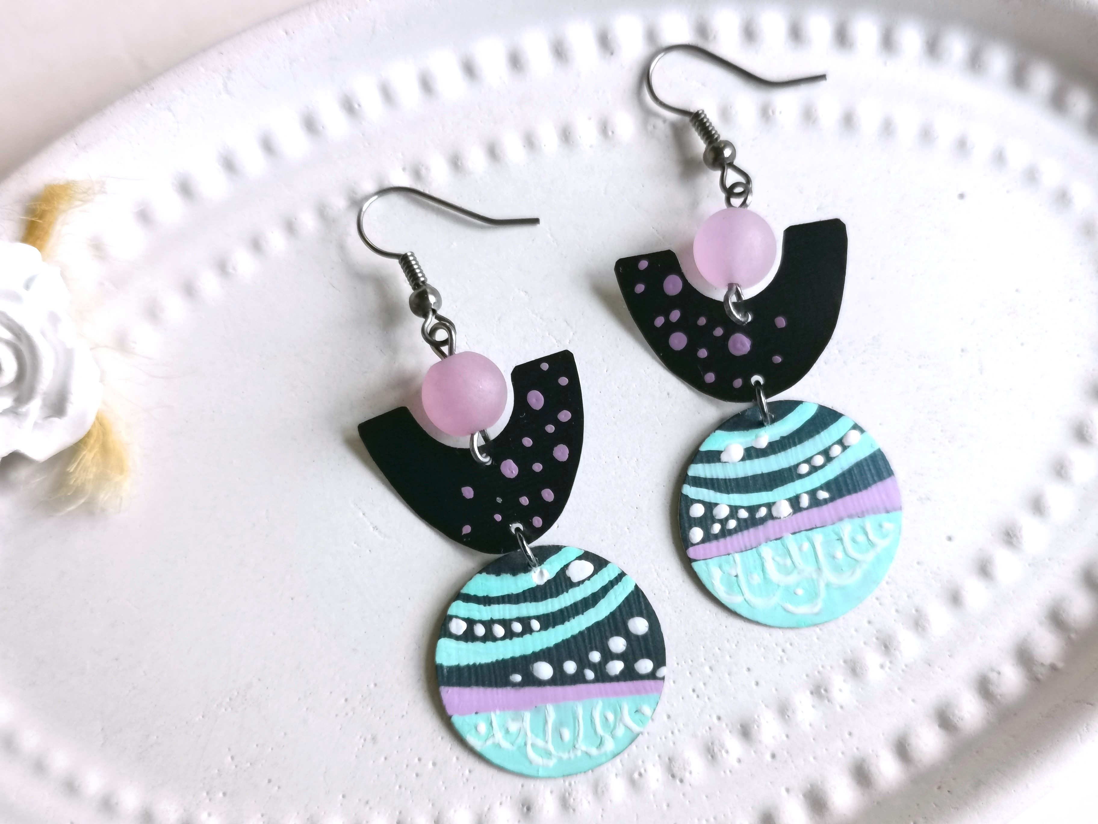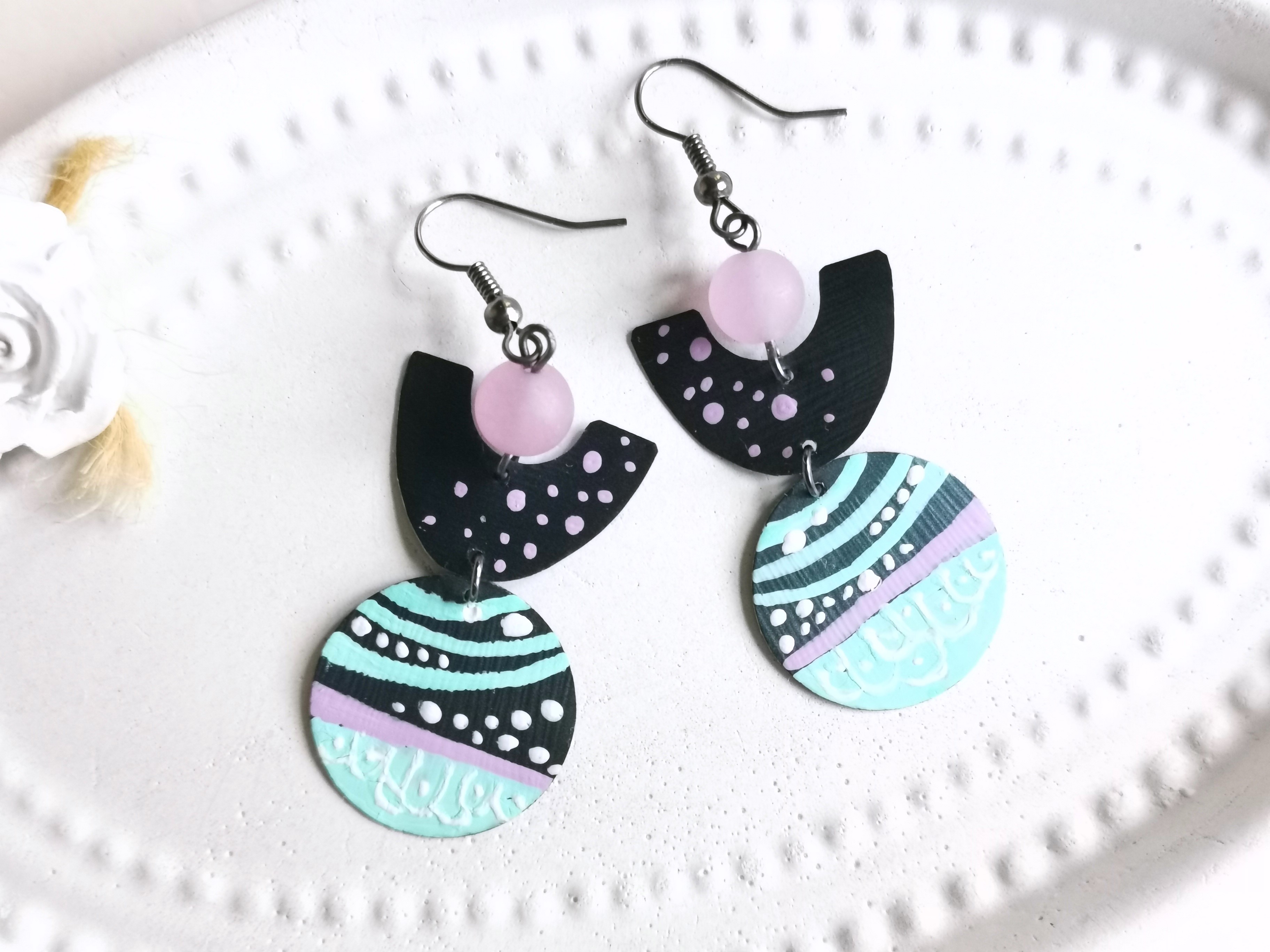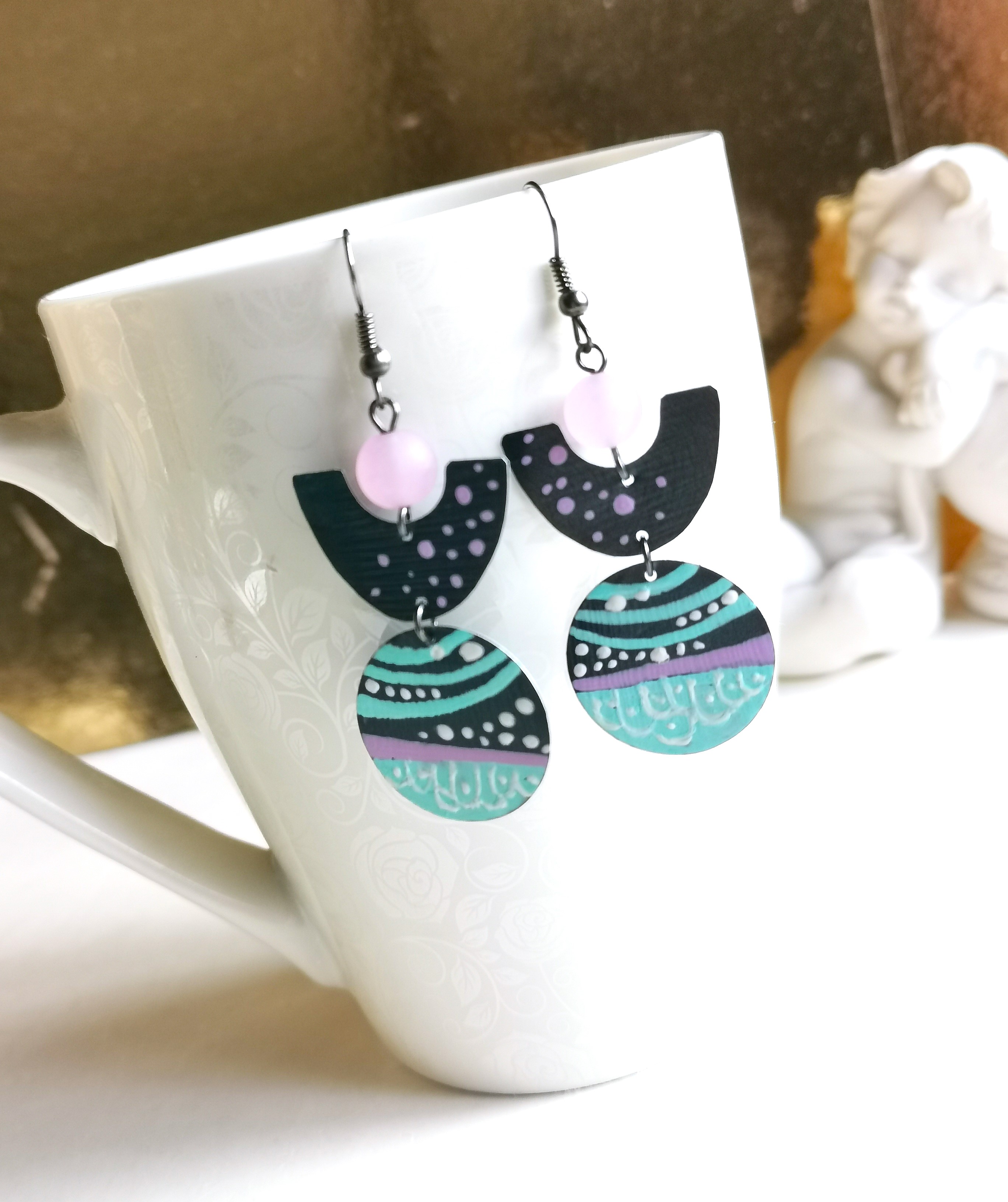 das recycelte Material aus Kaffeekapseln ist im Schmuckbereich vielseitig einsetzbar, so auch für schöne handbemalte Ohrringe im Art Deco Design mit Jadeperlen in flieder - ultraleicht zu tragen und auf jeden Fall ein Hingucker !!