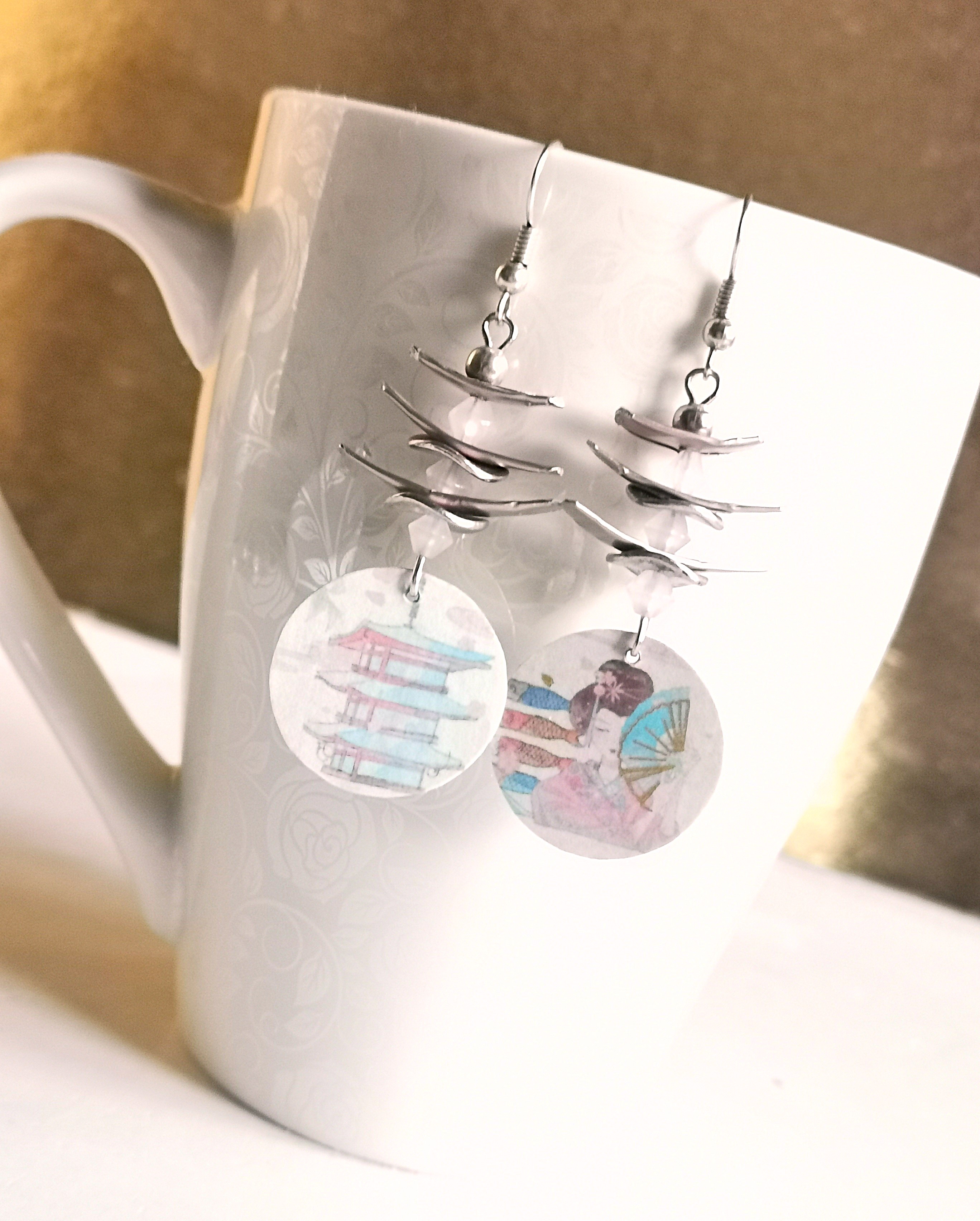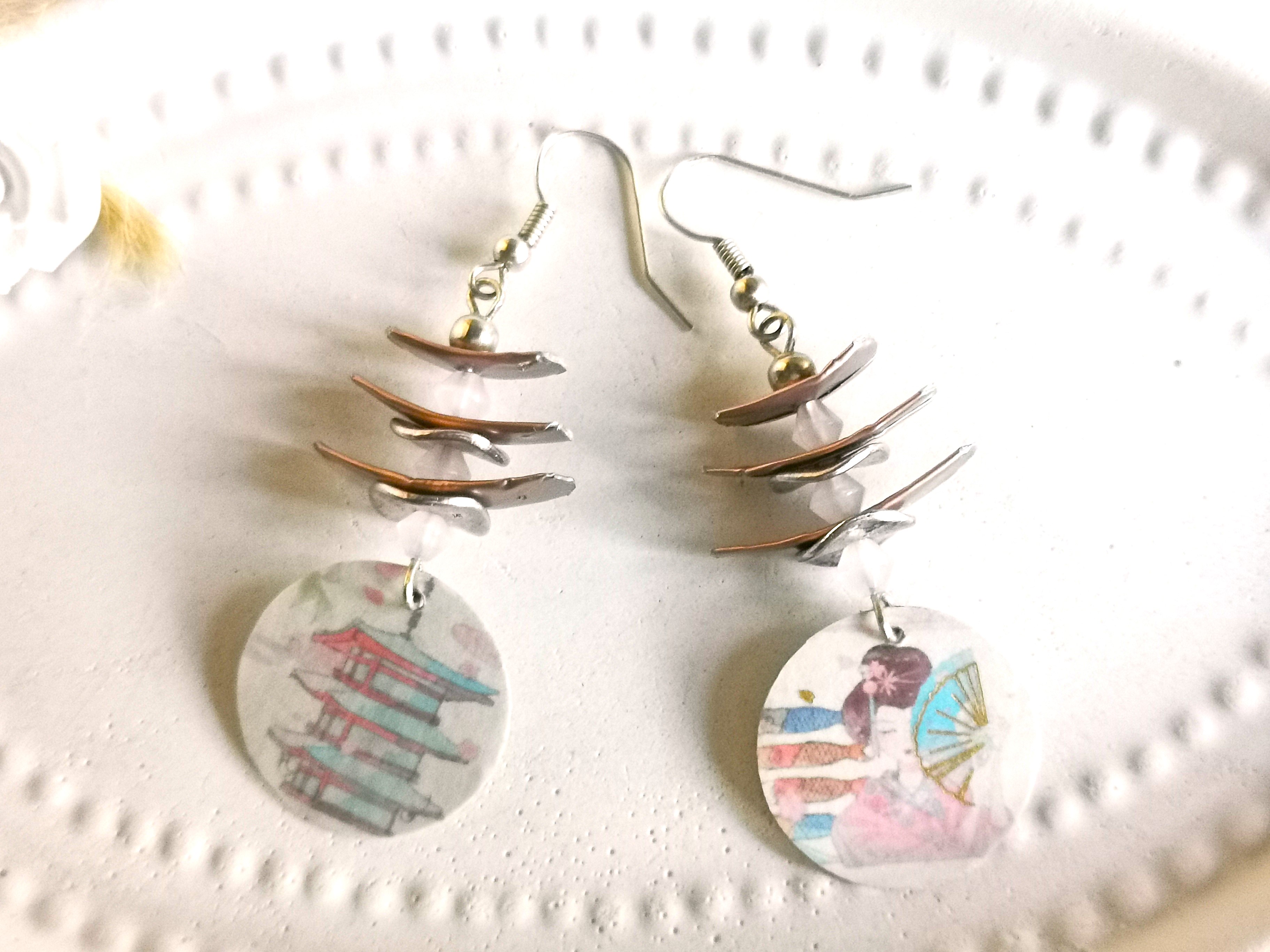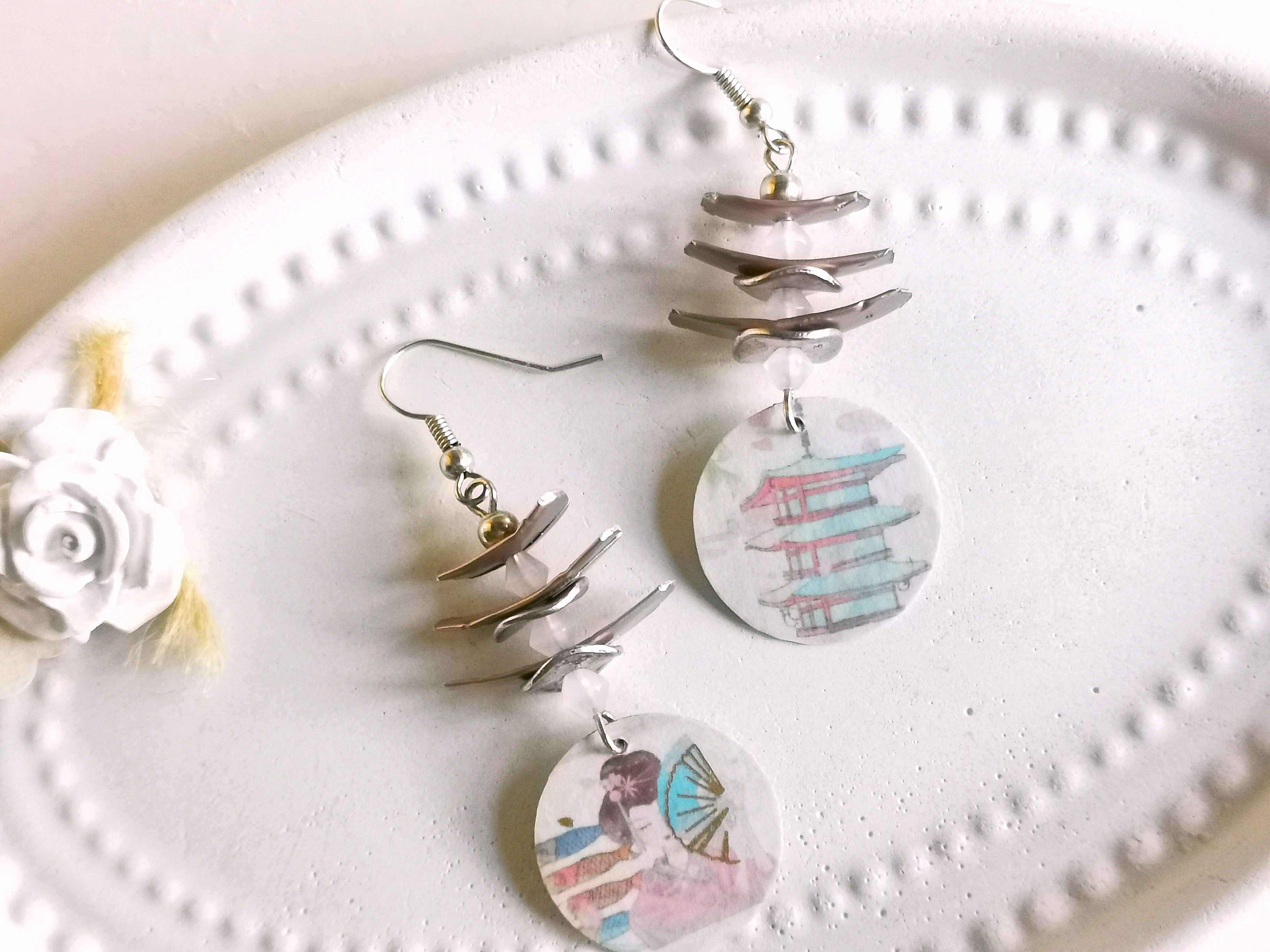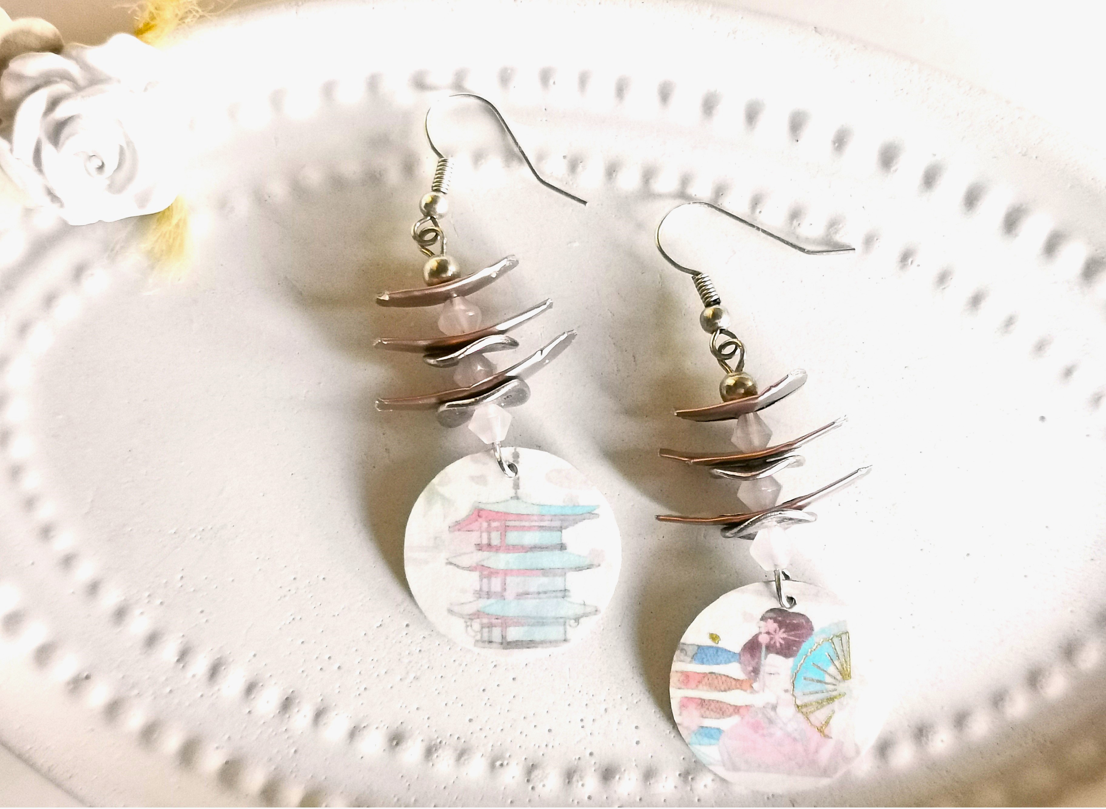 diese zauberhaften japanischen Pagoden Ohrringe bestechen durch ihr zartes Design mit dünnen Bogen-Plättchen aus Alu in metallic rose` und dazwischengesetzten Zylinderperlen mit Metall-Scheiben - unten baumeln Kreise mit japanischen Motiven
