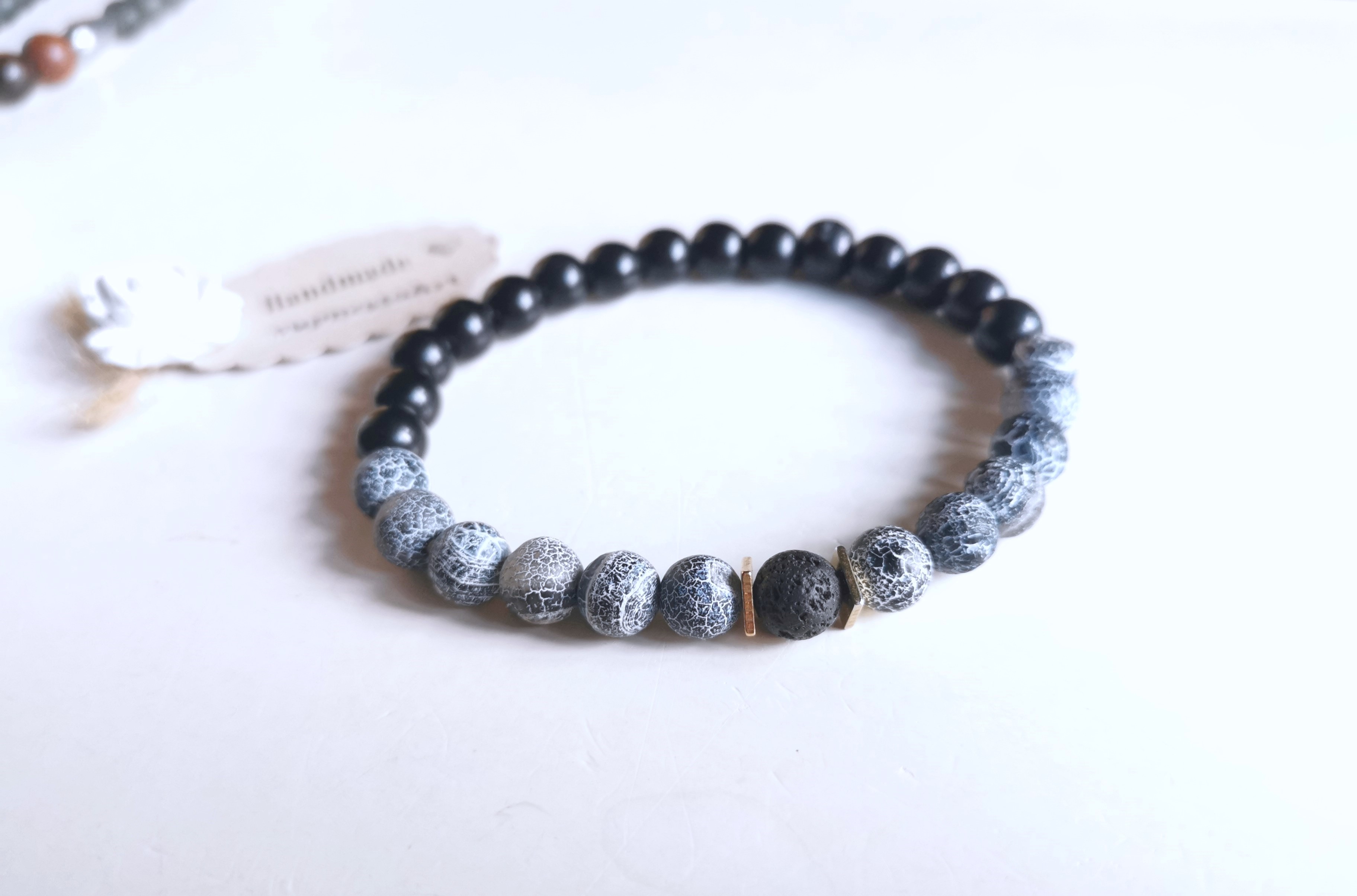 wunderschönes Armband mit toll gemaserten grauen Achatperlen und schwarzen Glasperlen - Blickfang ist eine schwarze Lavaperle zwischen goldfarbenen Spacern designt - dehnbar, da auf ein hochwertiges Marken-Silikonband aufgezogen