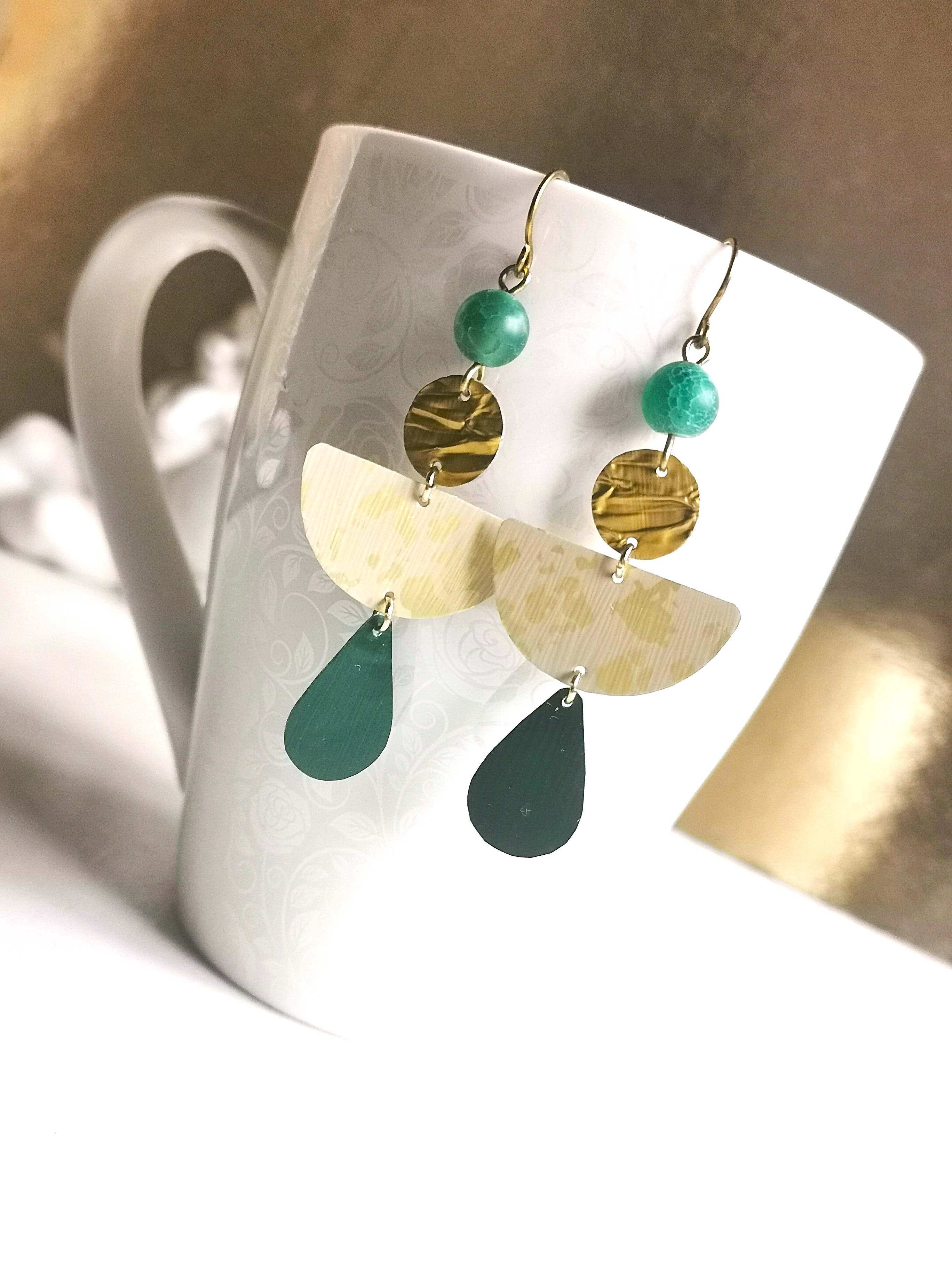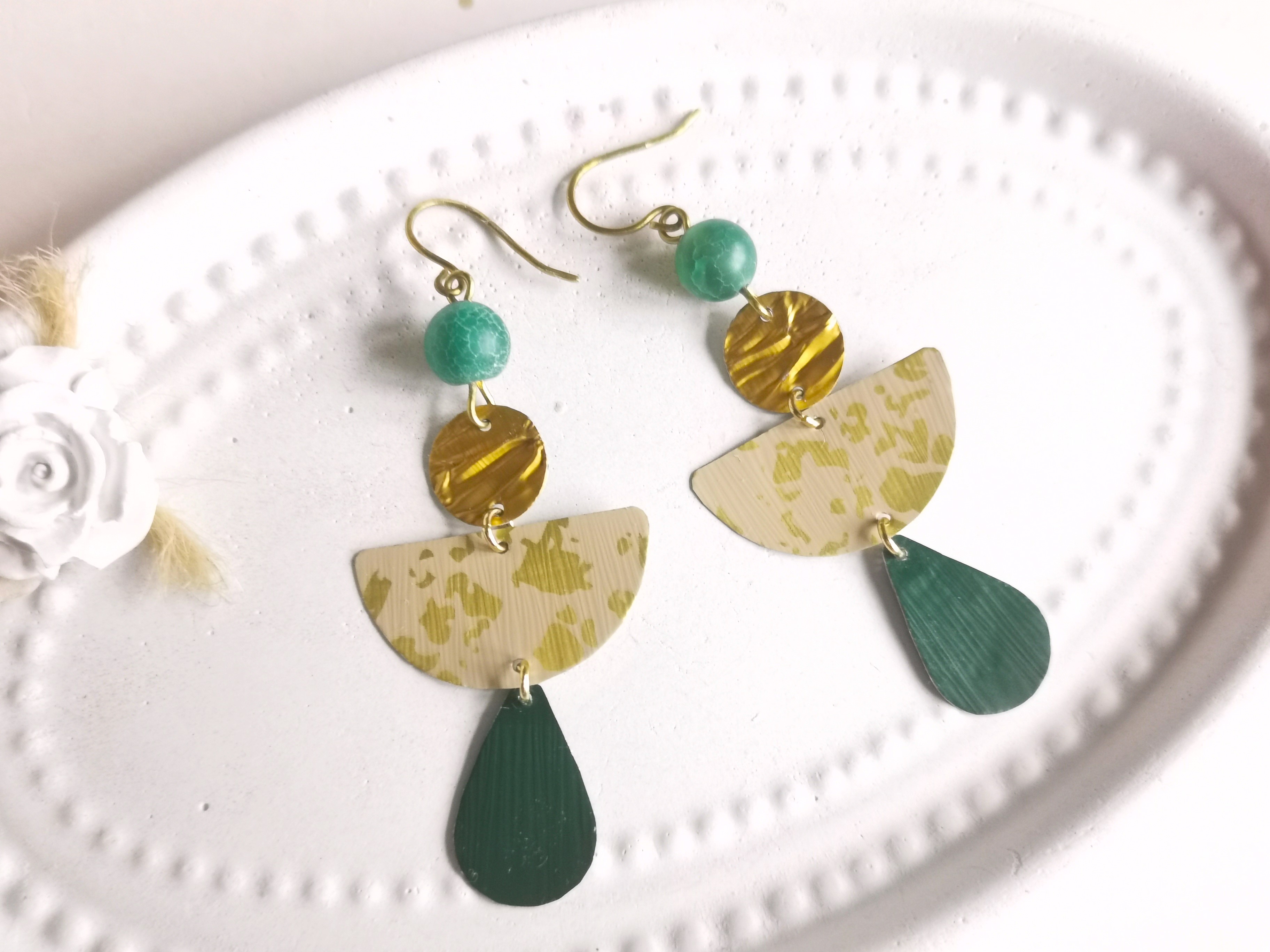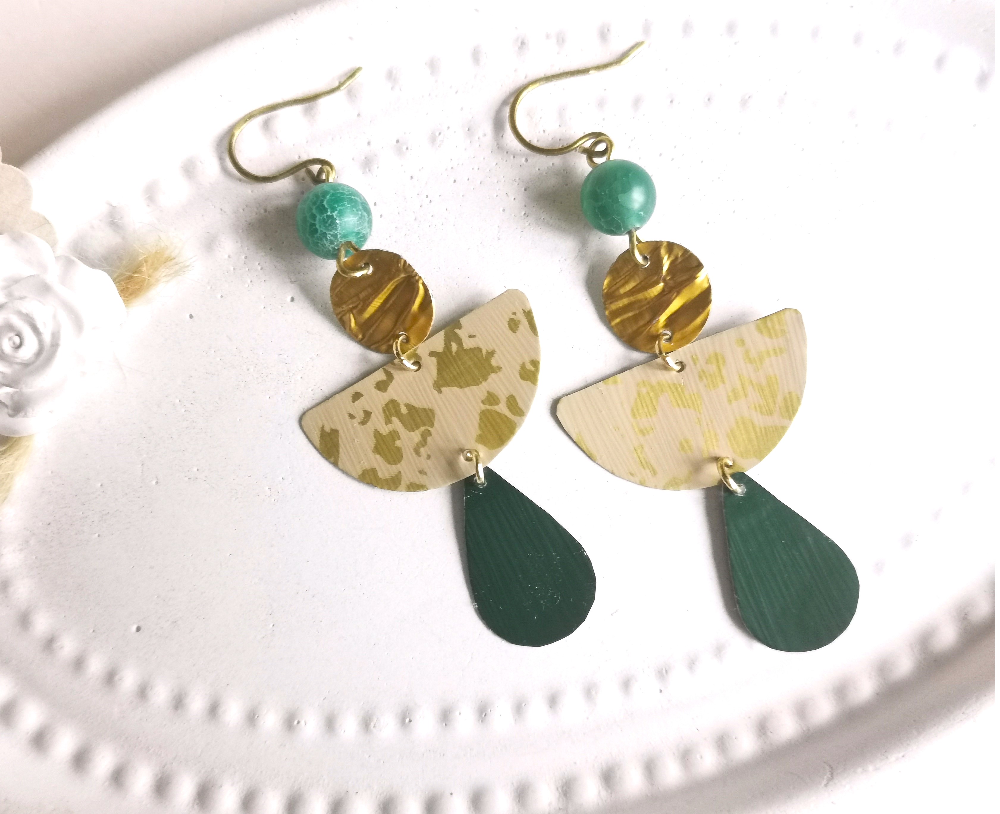 an reinen Messing Ohrhaken hängen Achate und selbstgefertigte Plättchen in unterschiedlichen Formen aus recyceltem Kaffeekapsel-Alu in den Farben Nude mit Blattgoldeffekt, Gold und Grün - die Verbindungsringe sind aus goldfarbenem Edelstahl - sehr leicht zu tragen.