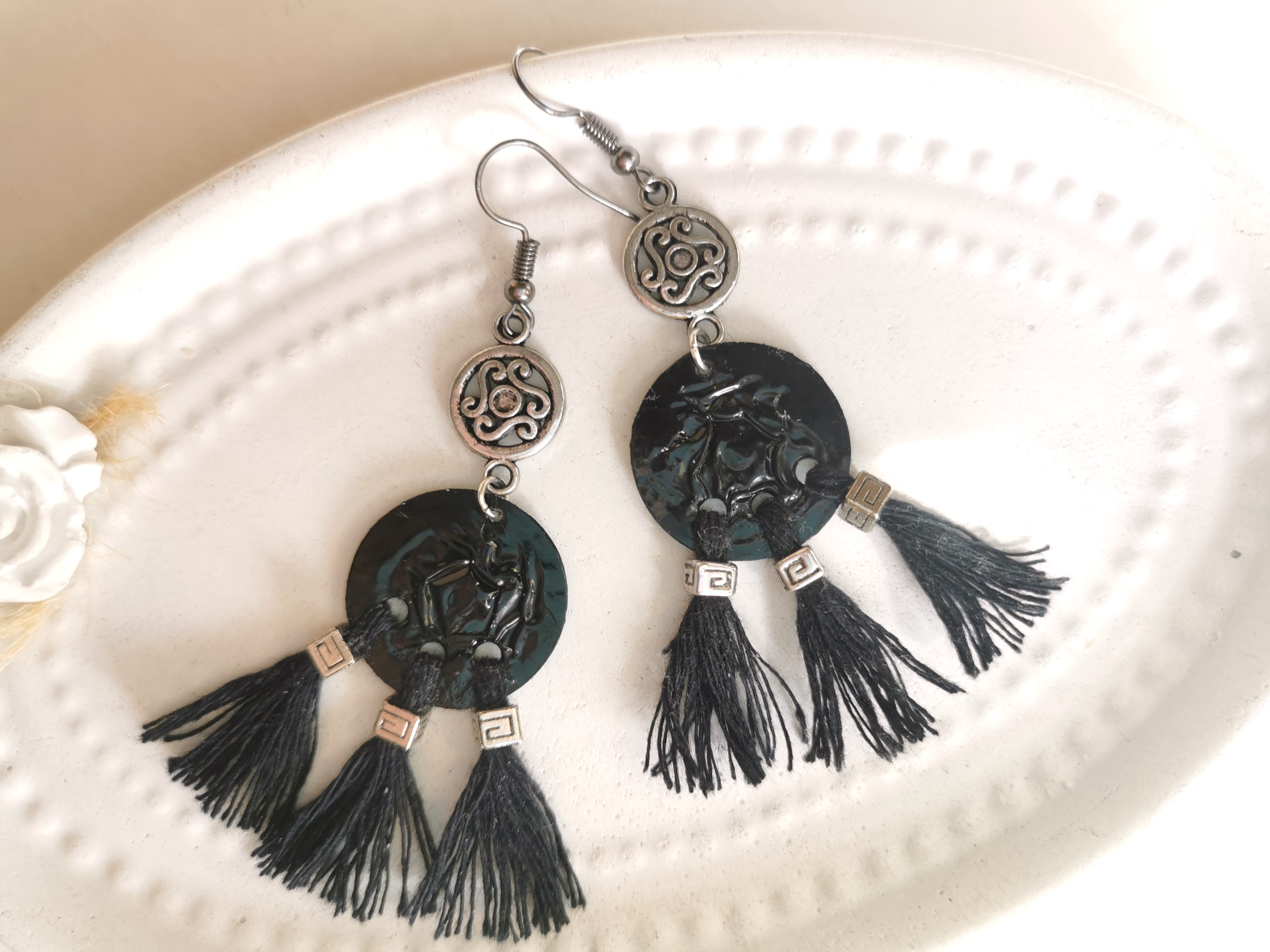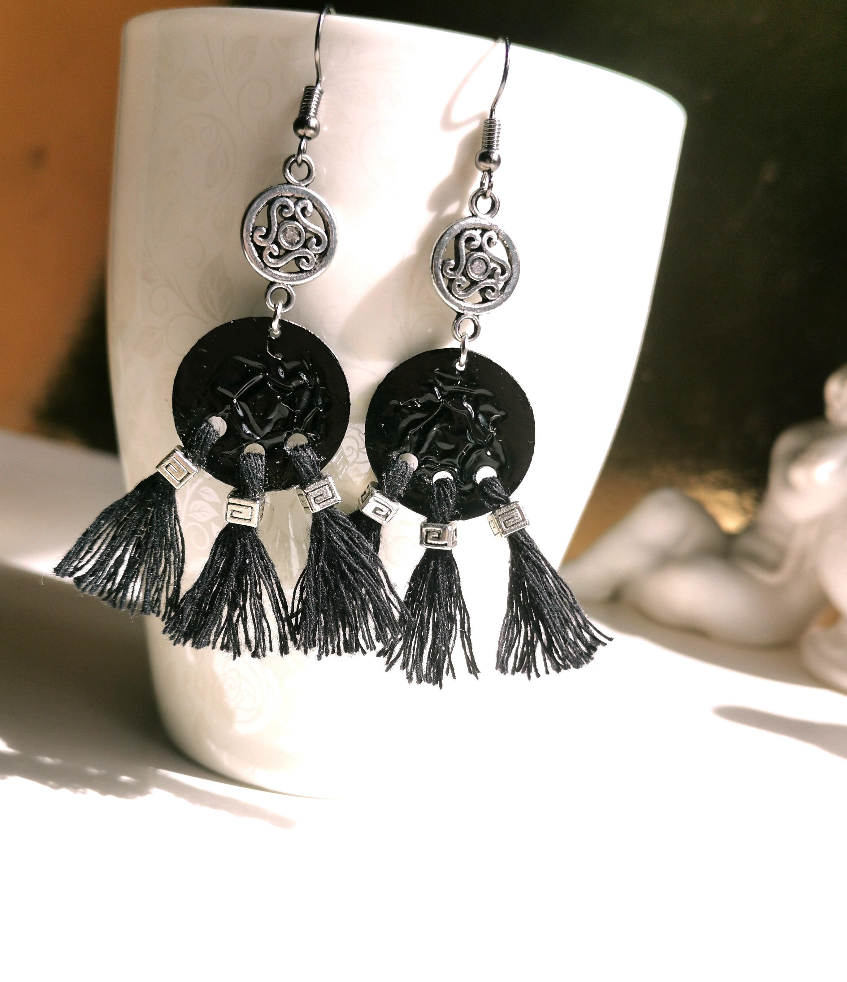 schwarze Boho Baumwoll Quasten Ohrringe Festival mit Scheiben aus Recycling Nespresso Kaffeekapsel Schmuck