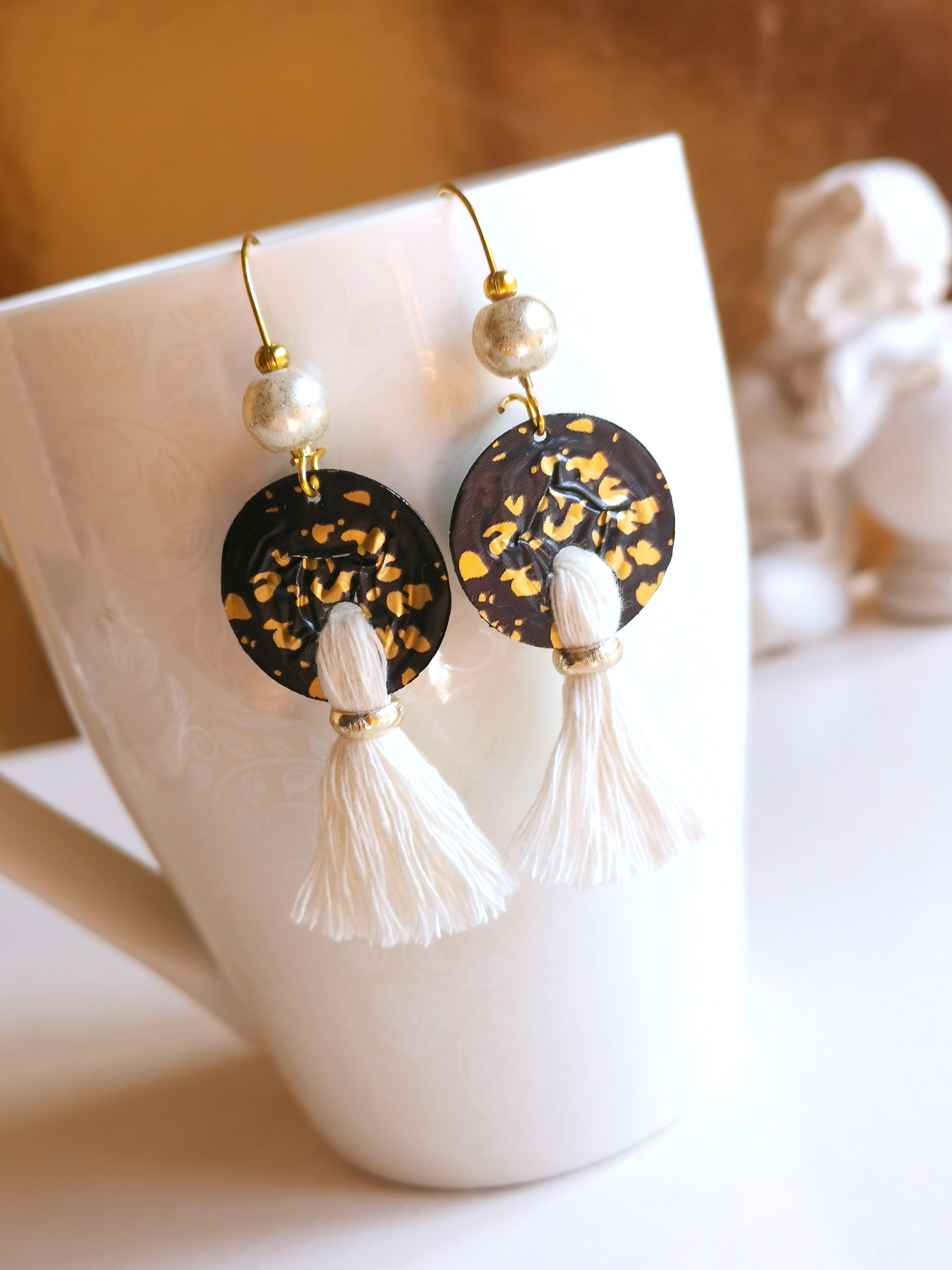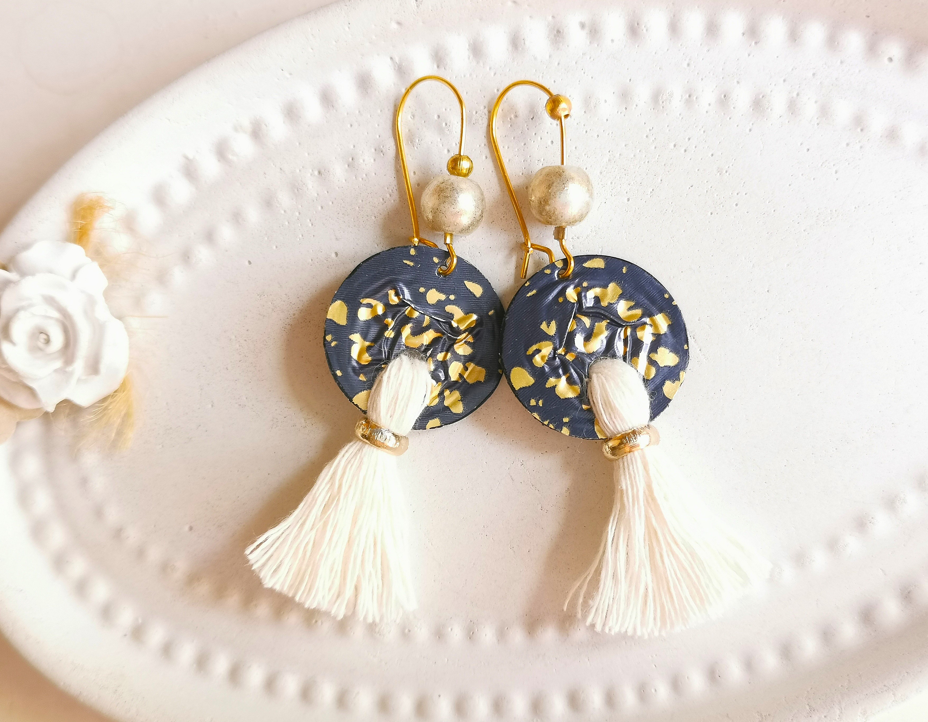 Statement Baumwoll Quasten Ohrringe creme blau terrazzo aus Upcycling Nespresso Kaffeekapsel Schmuck nachhaltig, creme Tassel Ohrringe