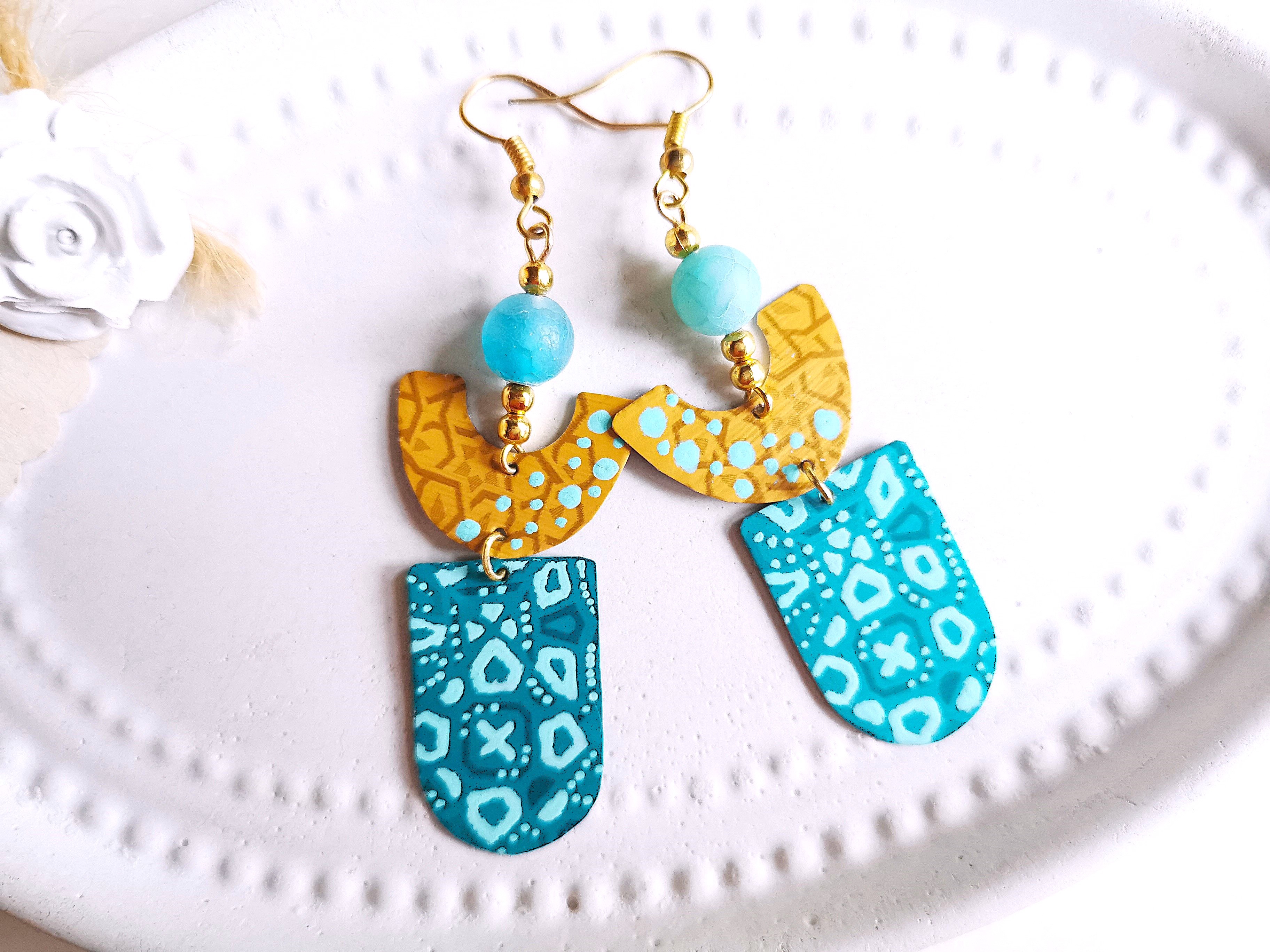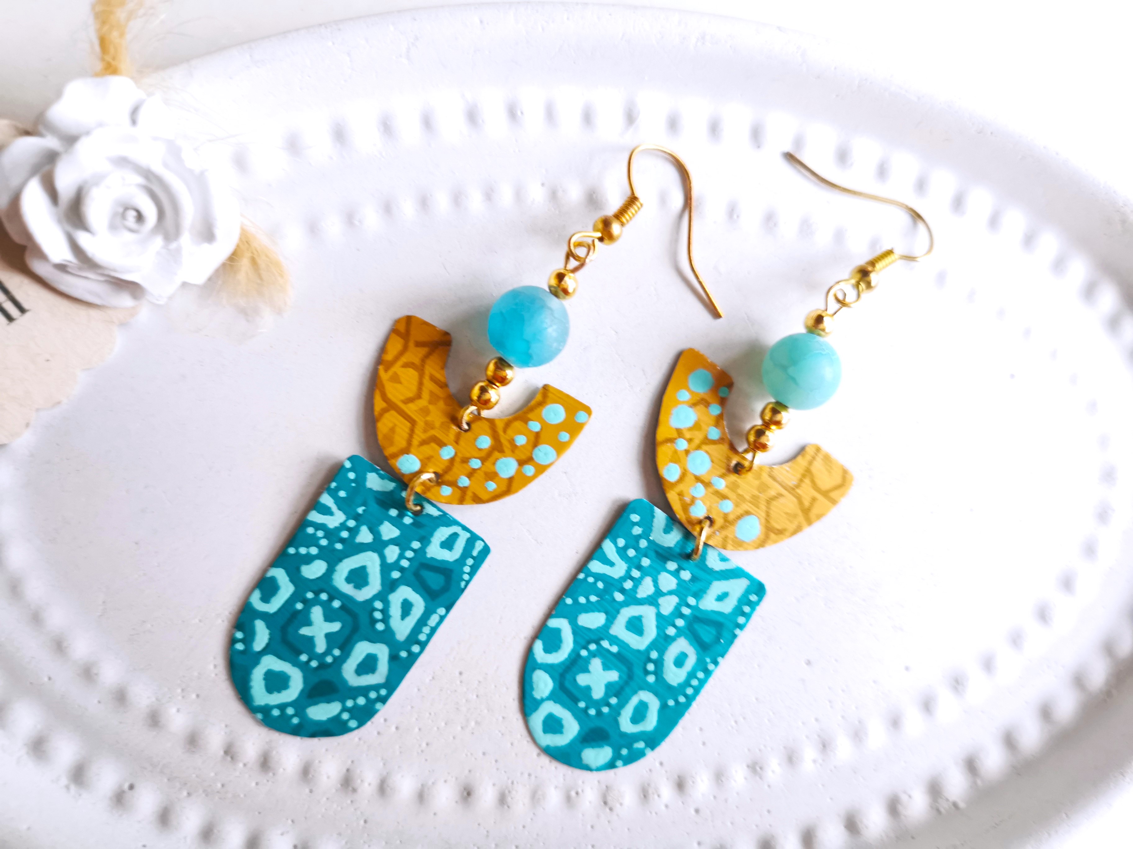 so auch für schöne chice handbemalte Ohrringe im Art Deco Design, ergänzt mit mattem Achat Edelstein in der passenden Farbe.