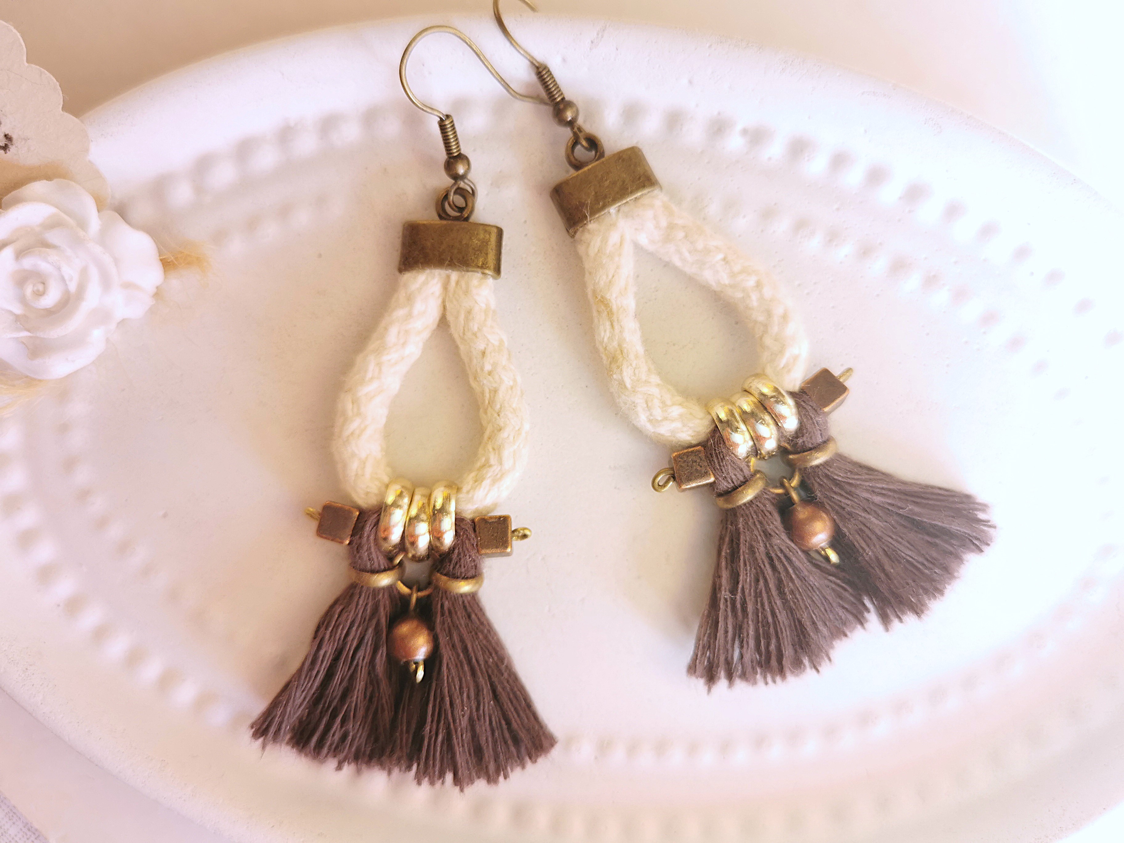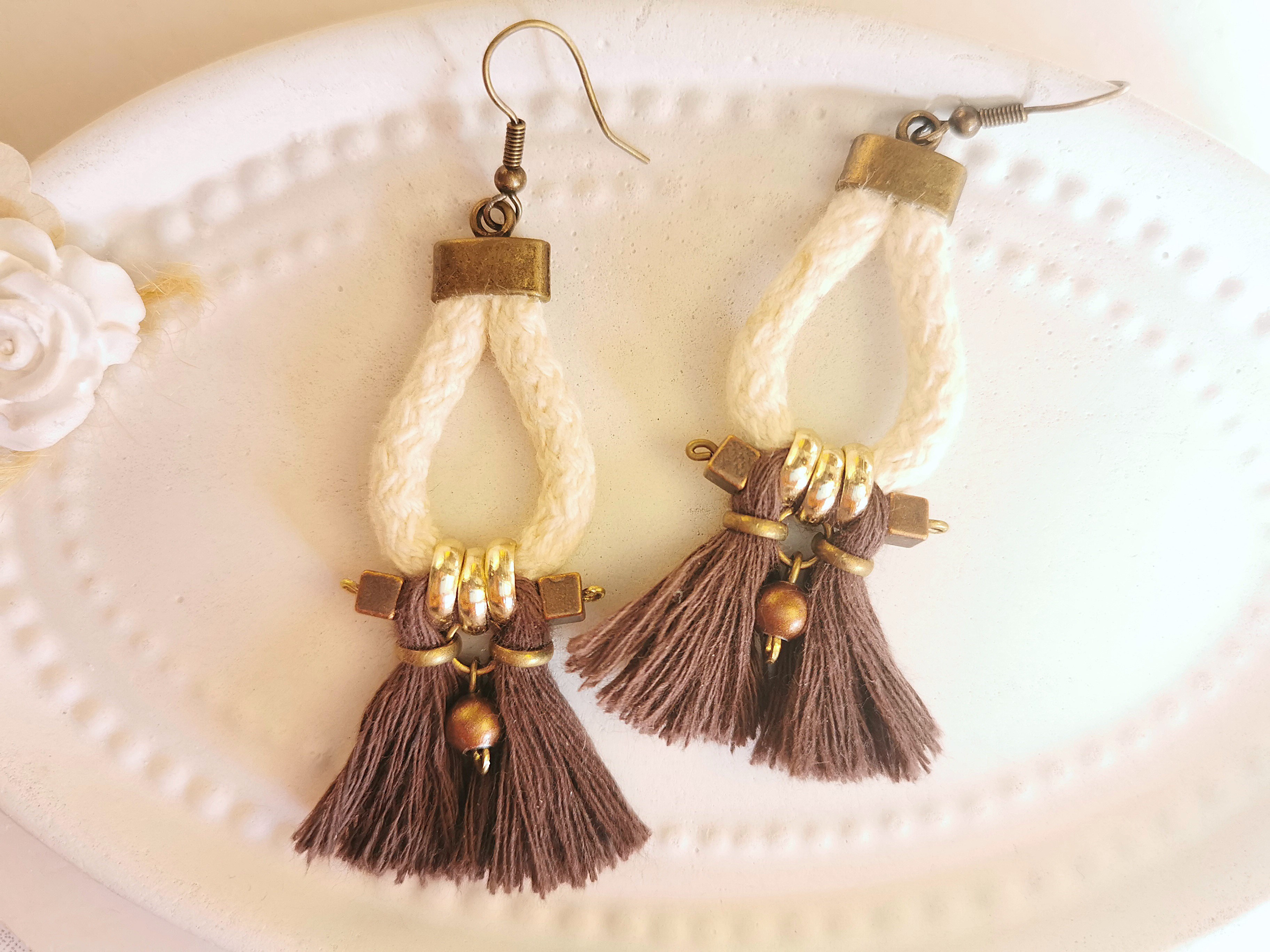 Statement Seil Kordel Ohrringe creme mit Quaste, braune Baumwoll Quasten Tassel Ohrhänger aus Kordel