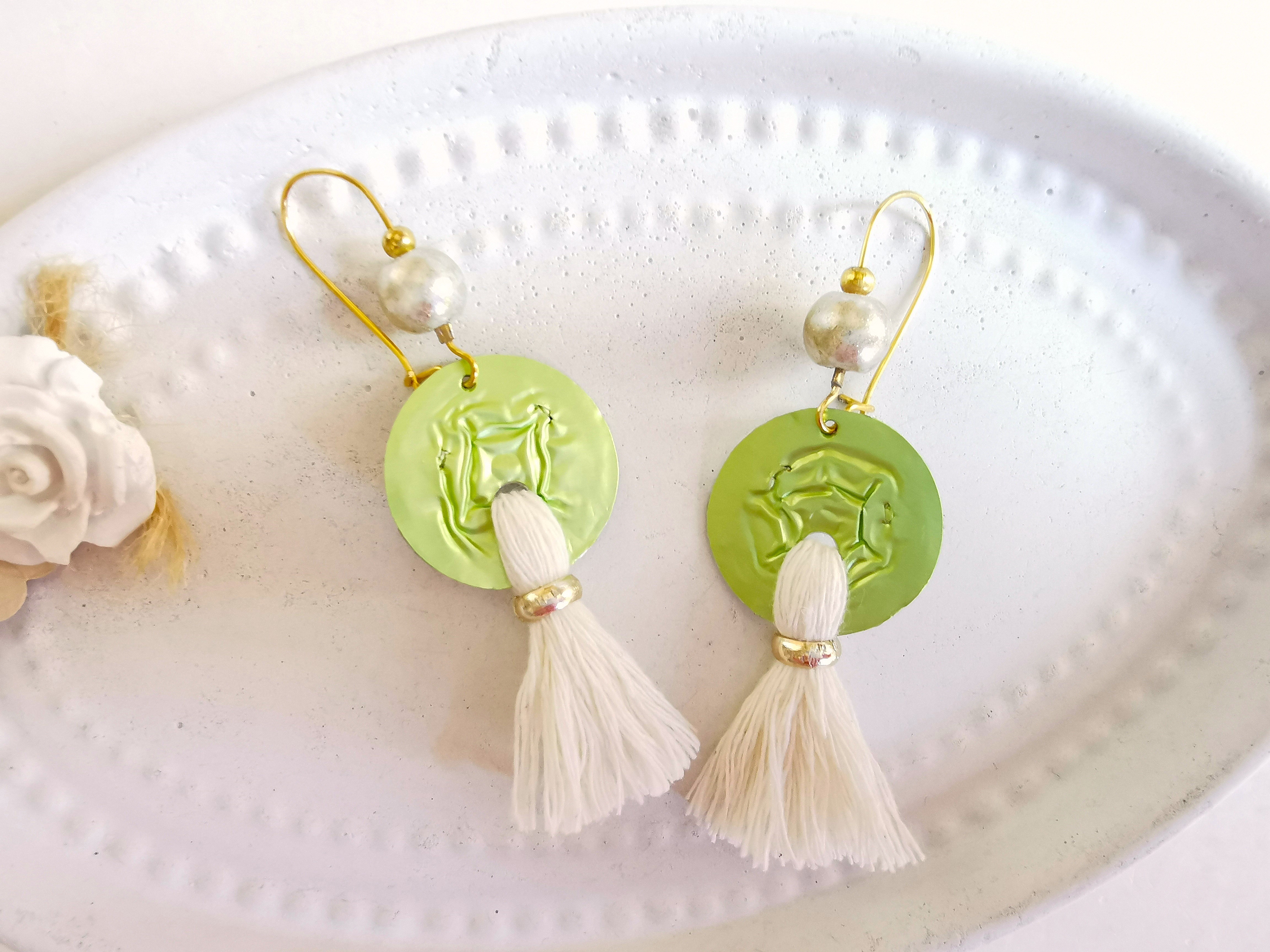 Upcycling Baumwolle Quasten Ohrringe grün gold aus Recycling Nespresso Kaffeekapsel Schmuck nachhaltig, Statement Tassel Ohrringe
