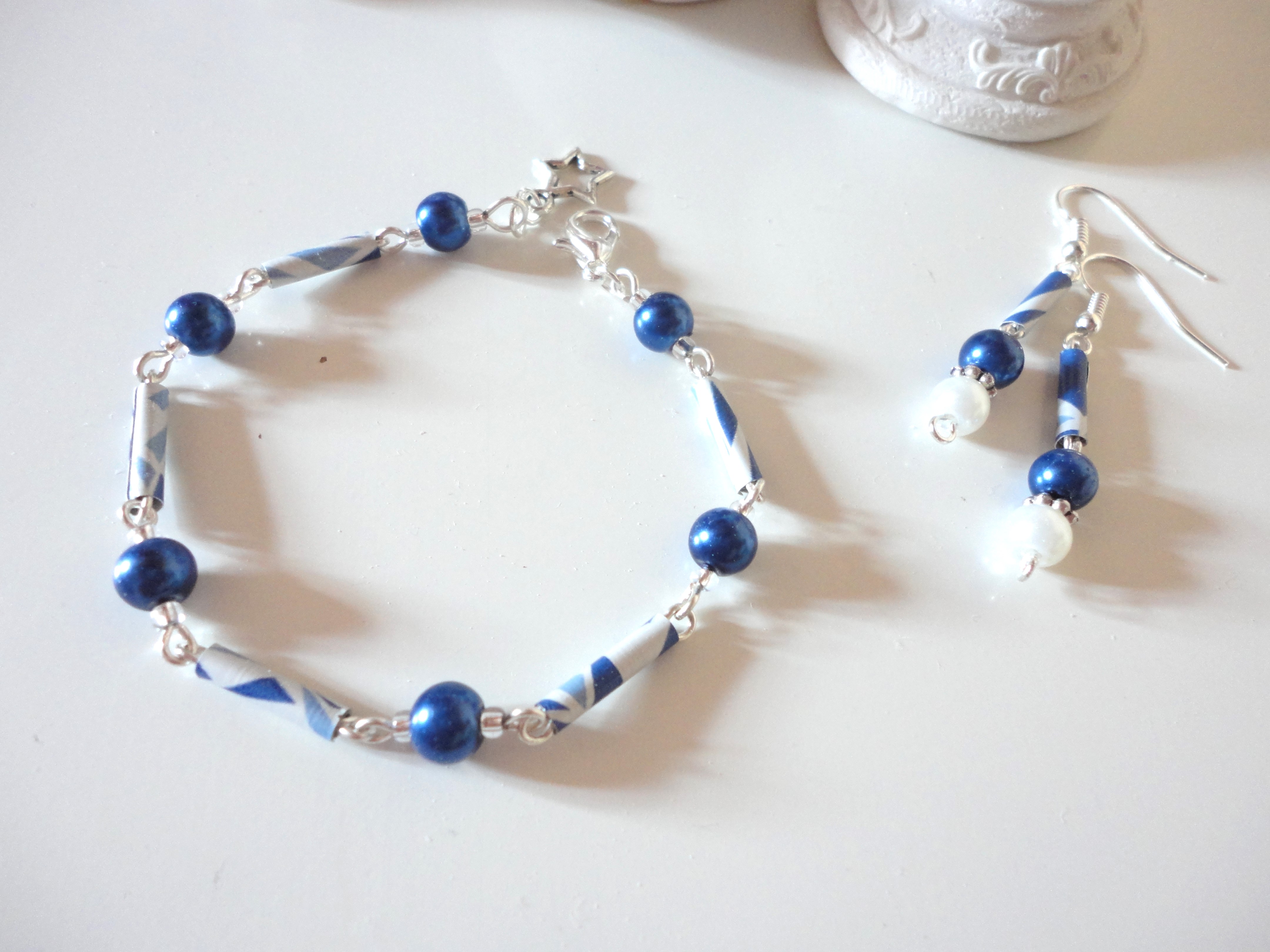 mit versilbertem Schmuckdraht selbstgeketteltes Armkettchen aus dünnen Aluröhrchen mit Geo-Muster und blauen Glanzperlen 6mm